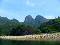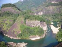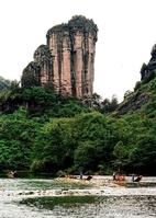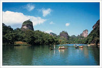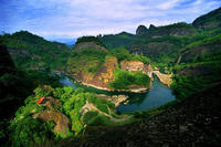 曲折縈回的九曲溪貫穿于丹崖群峰之間,如玉帶串珍珠,將36峰、99巖連為一體。山臨水而立,水繞山而行,峰巖高低、河床寬窄、曲率大小、水流急緩、視域大小、視角仰俯等都達到絕妙的程度,構(gòu)成“一溪貫群山,兩巖列仙岫”的獨特美景,溪光山色中溶注了中國傳統(tǒng)的詩情畫意和美學意境。登山可覽碧水清溪,涉水能看奇峰異石,乘一葉古樸竹筏順溪而下,可賞奇拔秀偉、千姿百態(tài)、爭奇斗妍的形象美;可品泉歌鳥鳴、浪擊輕舟、篙點褐石、綠樹紅花的色彩美;可看流水游魚、浮云飛鳥、艄公游人的動態(tài)美;可睹云繞山嶂、霧鎖峰腰、雨罩群峰的朦朧美,身臨秀色美景,猶如漫步奇幻百出的山水畫廊,聆聽豐富有變奏的交響樂章,欣賞韻味獨特的瑤池歌舞,品味韻律有致的美麗詩篇,如癡如醉,飄飄欲仙。這是武夷山自然景觀的精華,堪稱世界一絕。