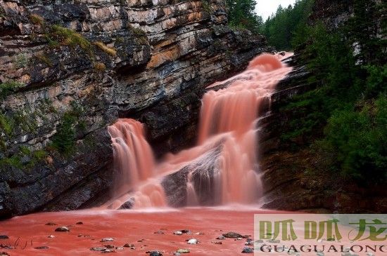 加拿大,阿爾伯塔,卡梅倫瀑布。由于雨水沖刷一種叫做“argolite”的紅色水中沉積層,卡梅倫瀑布的水變成了“番茄般”的紅色。
