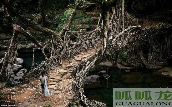 印度,乞拉朋齊,活樹橋。在印度梅加拉亞邦的深山里,可以看到一種不同尋常的“鬼斧神工”之景。這里,人們不用建橋,橋便自己“長”了出來。乞拉朋齊一年降雨多達50英尺(約合15000毫米),普通的木頭橋很容易被如此富足的雨水腐蝕。五百年前,當?shù)鼐用癖汩_始利用空心竹引橡皮樹的根藤跨越河流,直到它們在對岸生根。這樣,一座天然橋就完成了。