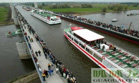 德國,馬格德堡,馬格德保水橋。正如所看到的那樣,一條河的上方流淌著另一條河,這架巨大的水橋花了六年時間建成,成為世界最長的可通行“立交河”。