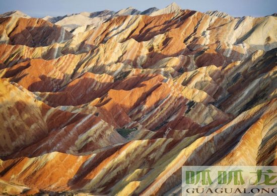 中國,甘肅,張掖丹霞地質公園。在此沉積了數(shù)百萬年的紅巖砂和其他礦石擠壓形成了如同斑馬花紋的奇特地貌。