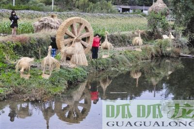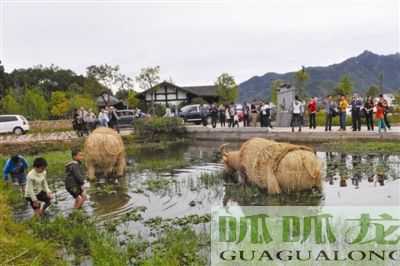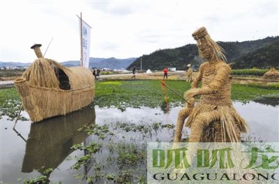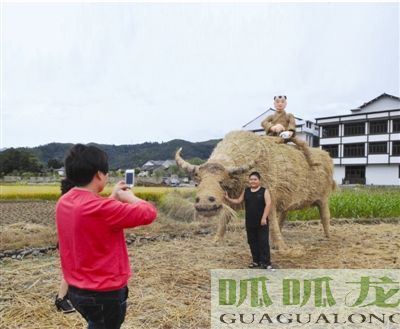 永嘉宣傳部一位劉姓科長告訴記者,“蒼坡古村周邊的稻田收割工作已經(jīng)完成,而小麥等其他作物又沒有種下,中間的這些稻田光禿禿的,影響了整個旅游點的形象,因此我們才想到請民間藝人利用這稻草,以永嘉耕讀文化和長壽之鄉(xiāng)為背景,做出長壽老人、牧童、水牛等具有永嘉鄉(xiāng)土文化的‘稻草人’,沒想會這么受游客歡迎!