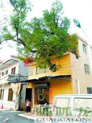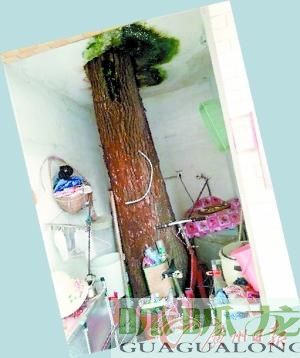 10年前建樓時(shí),宅基地上有棵樹,為保住樹房子環(huán)樹而建,給主要支干預(yù)留孔洞,如今這棵樹長(zhǎng)成了參天大樹,“破樓”而出。