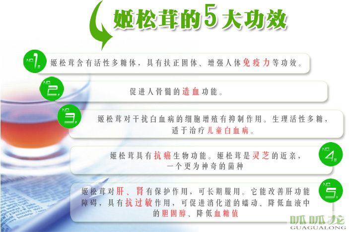 ² 姬松茸對(duì)干擾白血病的細(xì)胞增殖有抑制作用。生理活性多糖,適于治療兒童白血病。
